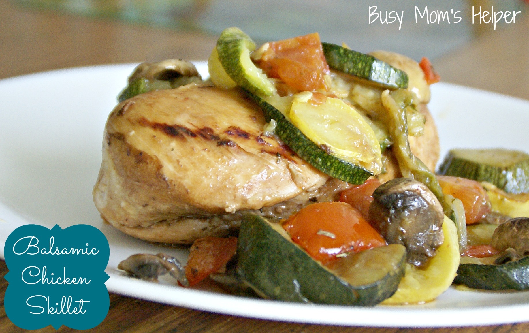 I’ve been getting a bunch of produce for a great price each week from this Co-Op produce group. It’s really made a difference with our meals, in that my budget has improved (yeah for spending less!!!) and also that we’re getting much more veggies in our diet. Especially FRESH veggies, not out of the can which is what we do more often than not. With all this produce, I’ve been having fun trying it in different recipes and combinations….LOVE experimenting, especially when it’s HEALTHY! This Balsamic Chicken Skillet with Veggies is so delicious, filling AND really healthy….talk about WIN-WIN!!! All it needs it to be easy….wait, it IS easy to make! You’re welcome 😉