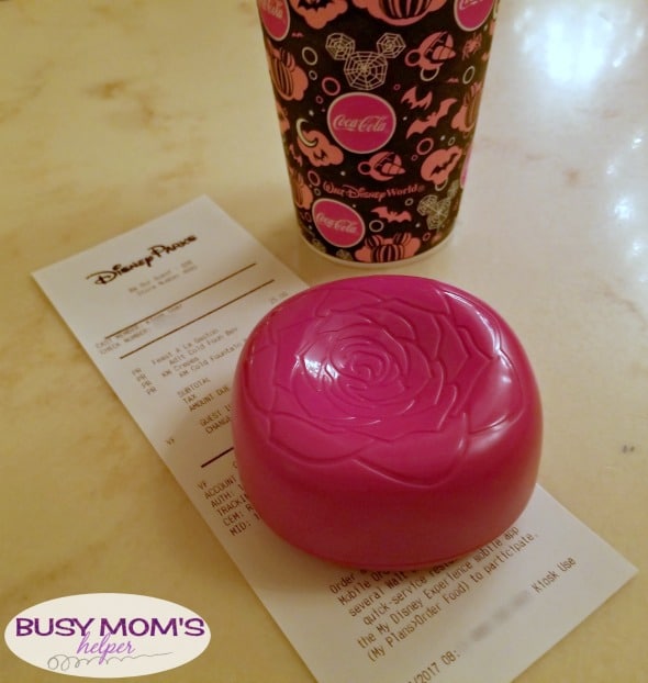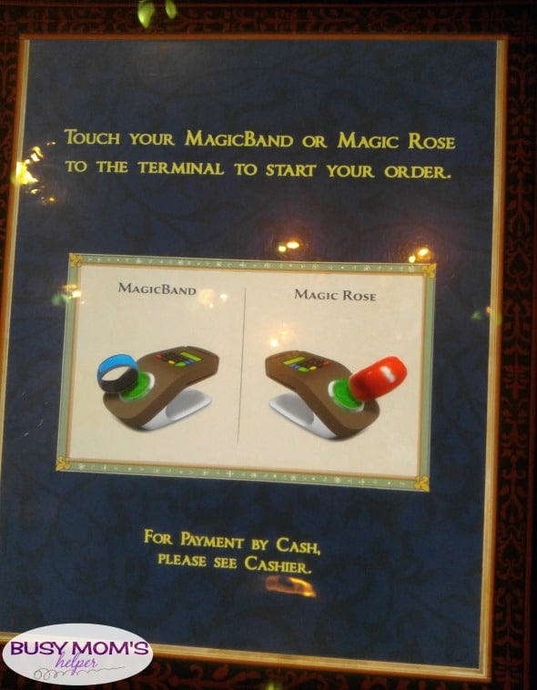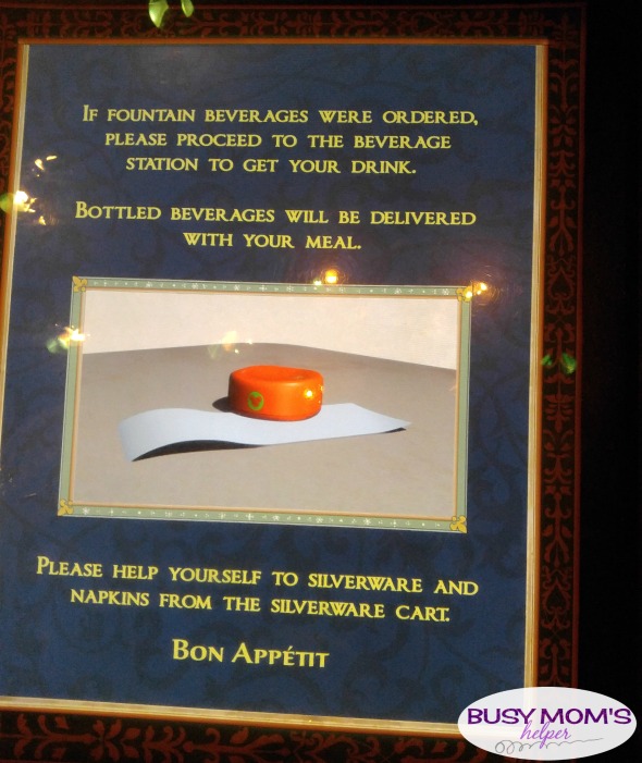 At the kiosk, it explains that you can use your MagicBand to order, or get a magic ‘rose’ disk to take to your table. Once you place your order with one of the friendly cast members, you go choose your own table in one of the three rooms (more on them below). They ‘magically’ find your table with your food! Really, they find your band or rose.