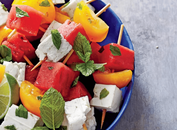 #3 Tomato, Watermelon, and Feta Skewers with Mint and Lime