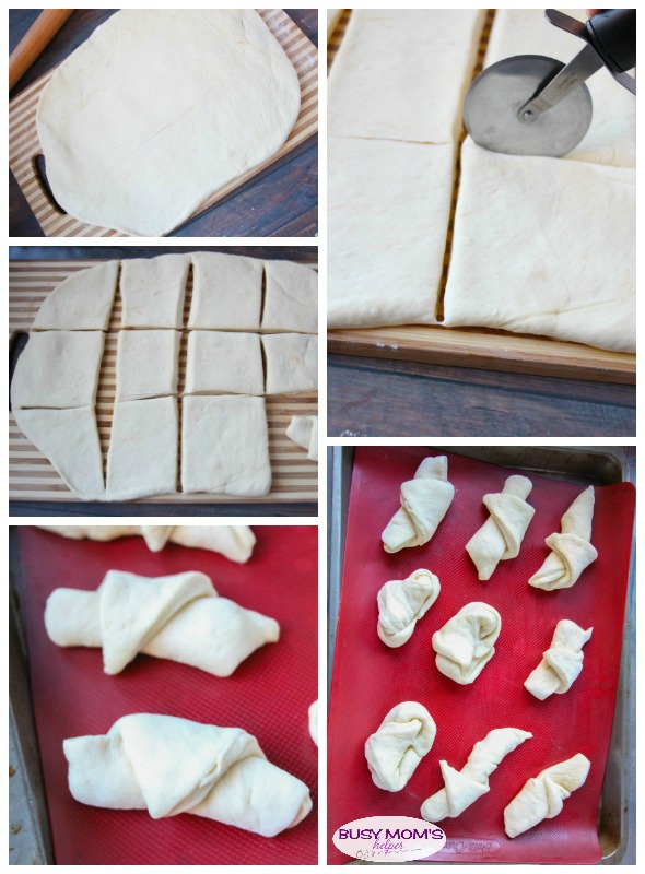 - Place on board and roll into a large rectangle. (I realized our rolling pin was still packed away in storage, but made it work with a cup). Cut rectangles into about 2″ x 4″ pieces. Brush each piece with butter, then roll up short end to short end. Pinch the seam to help it stay closed, then place seam-side down on sprayed baking sheet. These look crescent rolls at first, but bake into the right shape.