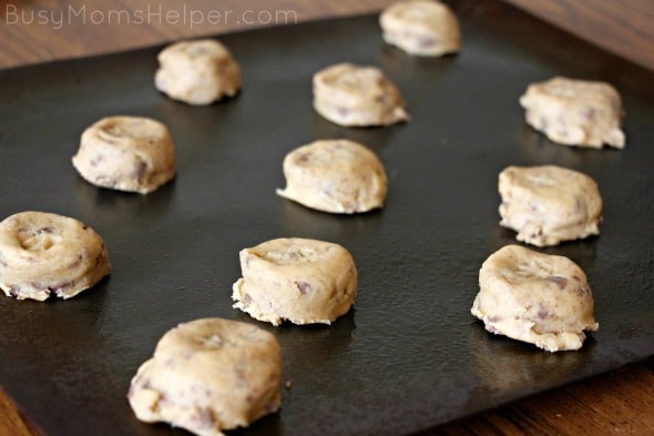- Scoop the cookie dough into 1″ balls and place onto the prepared baking sheets. Slightly press down.
