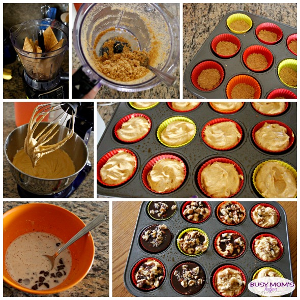 - In a blender, blend the 3 crust ingredients until well-ground. Divide into the 12 muffins cups, then press down so it’s flat. Bake for 5-7 minutes, or until starting to turn golden brown. Set aside to cool.