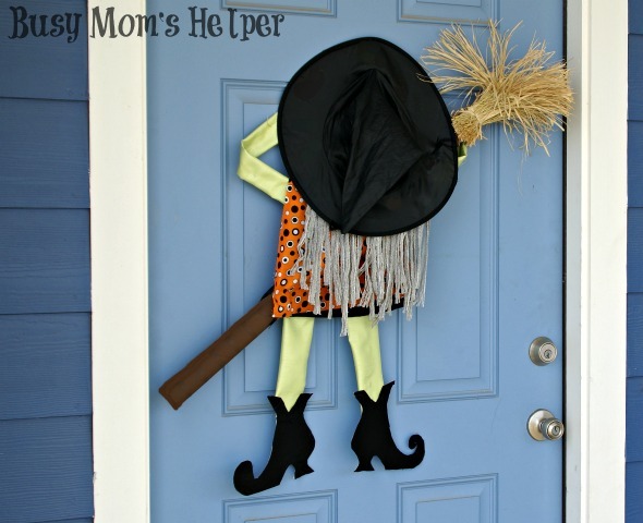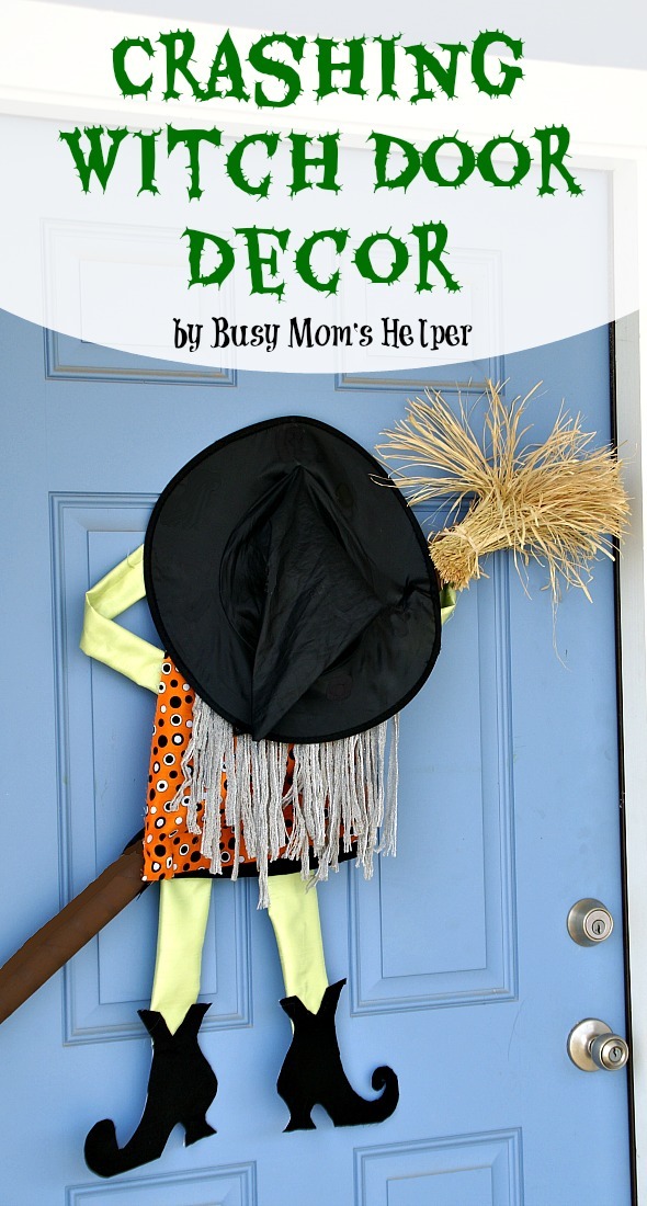 I’ve seen so many fun Halloween porch decorations lately, it made me want to do at least SOMETHING to spruce up our rather plain porch. I’ll admit, my front door has always been really basic, with a stylish, fun but simple wreath on it, usually. That’s it. I wanted something a bit more, and decided this Crashing Witch Door Decor would be perfect!