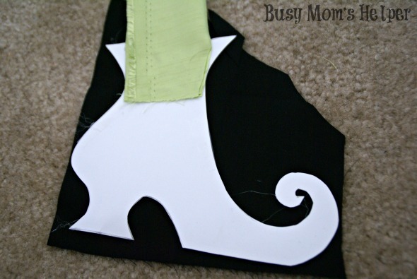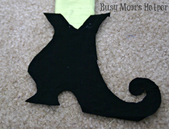 - Print off the shape of the shoes here. Trace it onto cardboard or cardstock, and cut out. Paint your ‘broom stick’, if you need to. Cut some black fabric to cover the shoes.