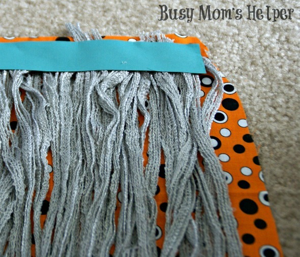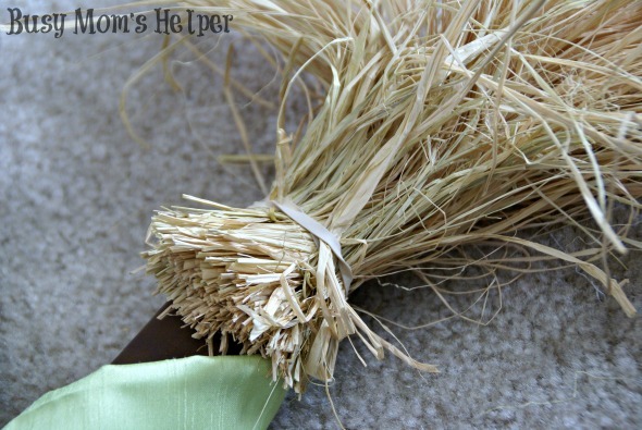 The cardstock strip will be hidden under the hat, but it saved my fingers from hot glue burns sticking on the yarn. Hot glue on the arms, as desired. - Duct tape your paper towel rolls together, then use a rubber band to secure a bunch of broom fibers/raffia to one end as the ‘broom’.