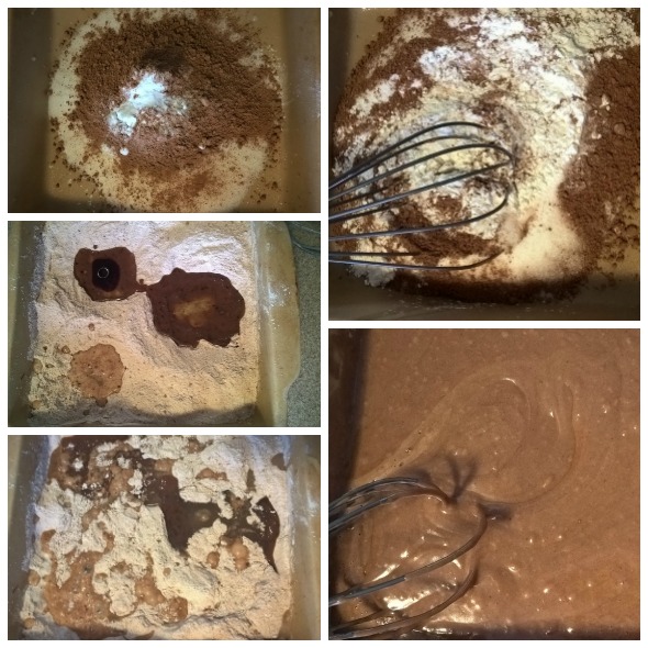 - Dump the flour, sugar, cocoa powder, salt, and baking soda into a greased 8” by 8” baking pan and whisk together until evenly blended.