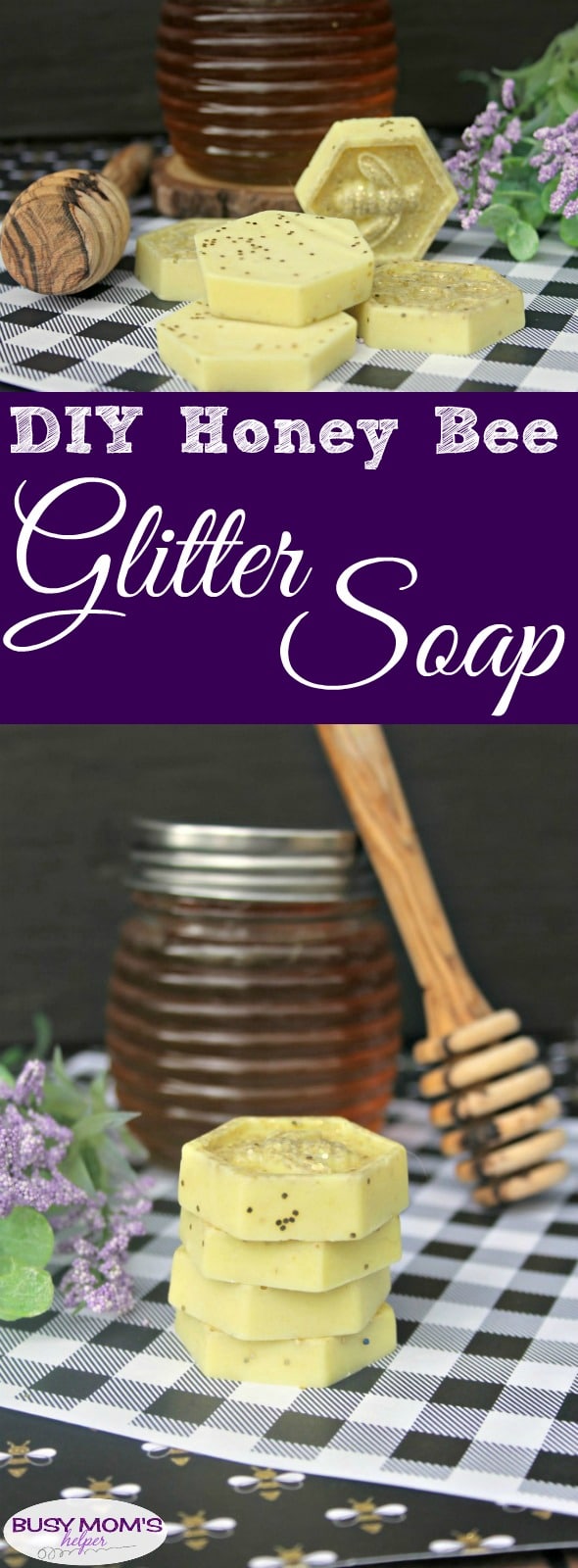 I use to think homemade soap was a craft for preteen girls doing a spa-themed party or something. No idea why that was what I thought, but now I know that there’s so many people who enjoy whipping up DIY soap recipes at home. And I get it – you get to choose what ingredients go into it (no harmful chemicals, or ingredients you can’t even pronounce), plus make them into any creative color, shape, scent or style you’d like! Now THAT sounds like my kinda thing 🙂 Whether you’re a pro or just wanting to try making your own for the first time, this DIY Honey Bee Glitter Soap is super simple, plus turns out amazing for a gift – or just to enjoy in your own home!