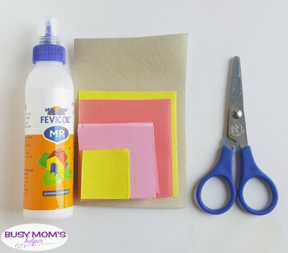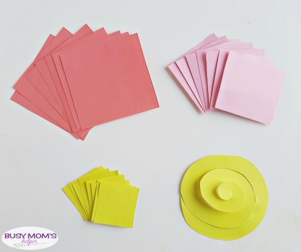 - Select 3 or more different colors of craft paper for the flower and cut out square shapes from them. Cut out the squares in 3 different sizes and for each size cut 8 pieces of squares. Also cut out a round pattern, then cut it into a spiral.