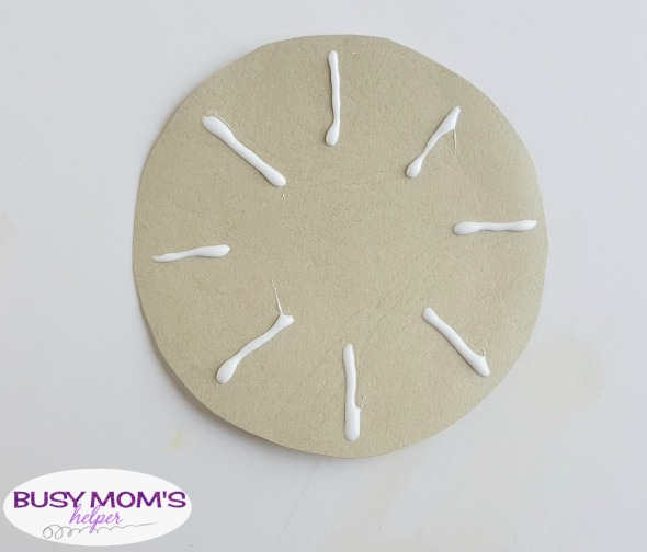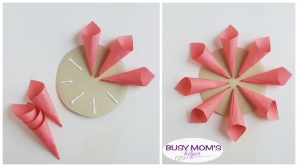 - Take the large cones and place each cone on each lines of glue with the cones’ open (wider) end facing outwards. Make sure to keep even gaps between the cones and arrange them nicely.