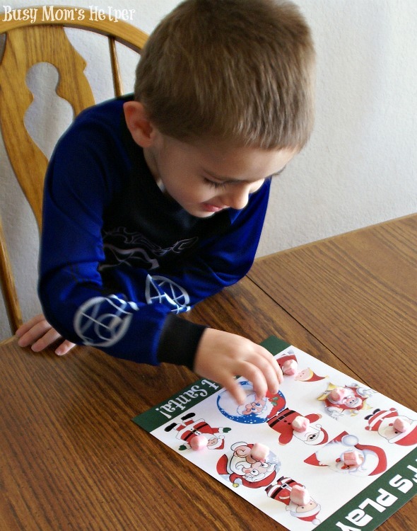 - Place candy/marshmallows/something on each of the Santa faces on the card. Choose a person who is ‘it’. They leave the room while everyone else chooses which Santa is the one for that round.