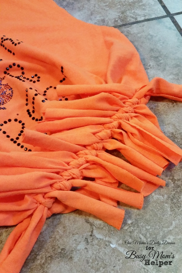 4. Line up the fringe and tie each front piece with the coordinating one on the back. You’ll probably have a lot of gaps at this point.