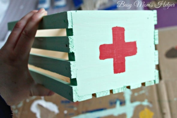 - Paint your crate the color you want. I added a red cross on the two sides of mine, since it’s an ‘EMERGENCY’ kit.