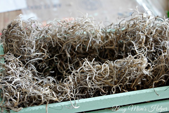 - I chose to use fake grass type stuff for my filler. Since I didn’t want it to fall through the cracks on the bottom, I lined it with some tissue paper.