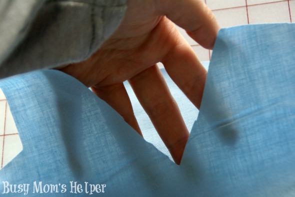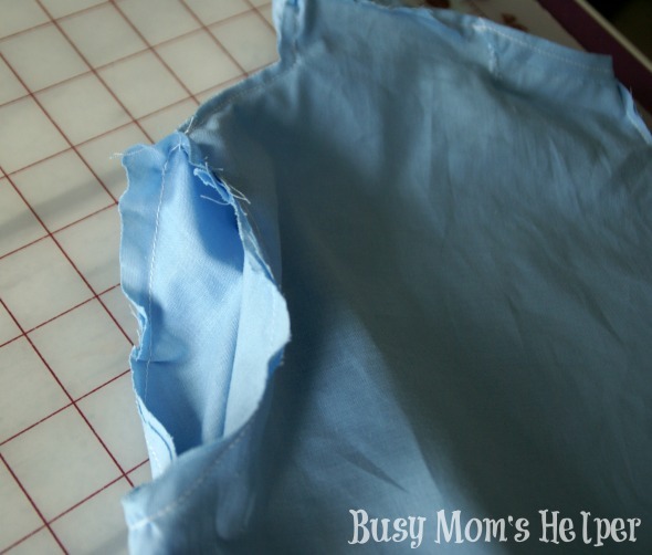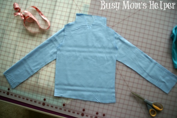 - Hem the bottom of the skirt, then sew the two sides together to make it an actual skirt piece. Being sure you put the smaller end to the bodice, sew the skirt to the bottom of the light blue bodice. Again, be sure to sew inside-out so the pretty seam is on the outside.