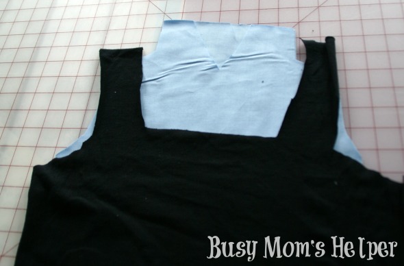 - Either sew or hot glue the black bodice piece over top the light blue top.