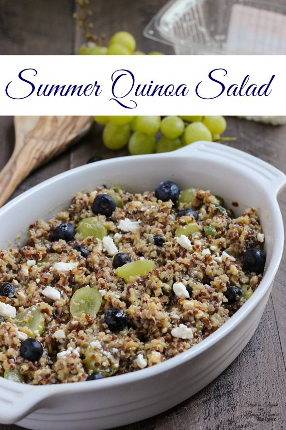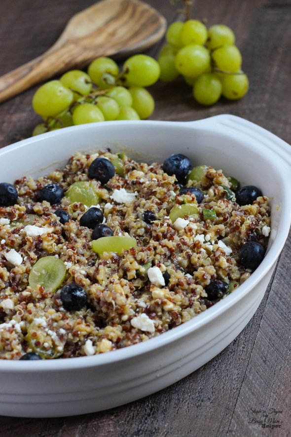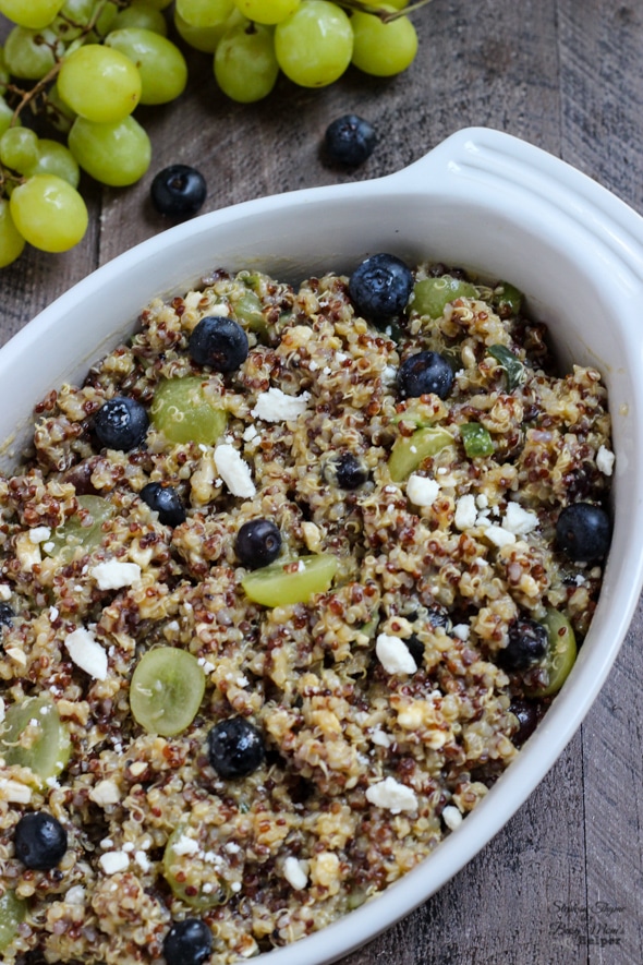 - Place the blueberries, feta, cucumber, and grapes in a large bowl. Pour the cooled quinoa over top. Add the vinaigrette and toss gently to coat and combine the ingredients. Season to taste with additional salt and pepper.