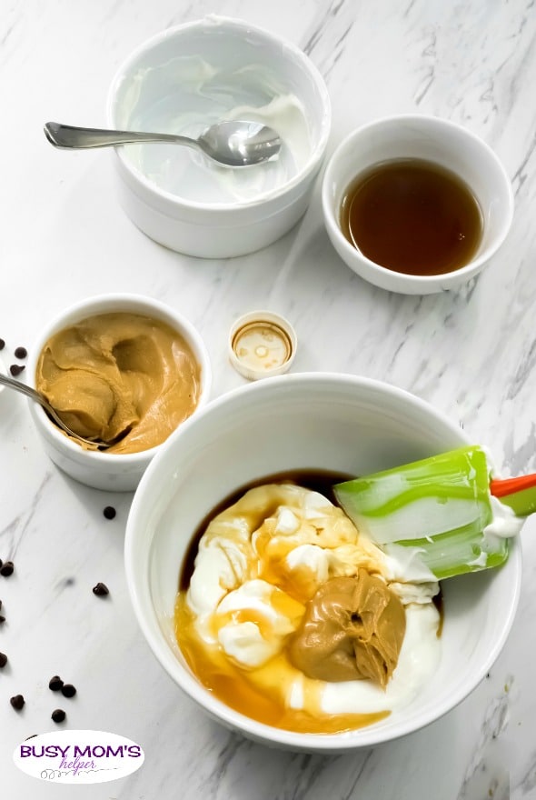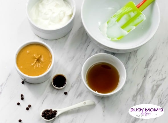 1. In a big bowl combine the Greek yogurt, peanut butter, vanilla extract and honey or maple syrup.