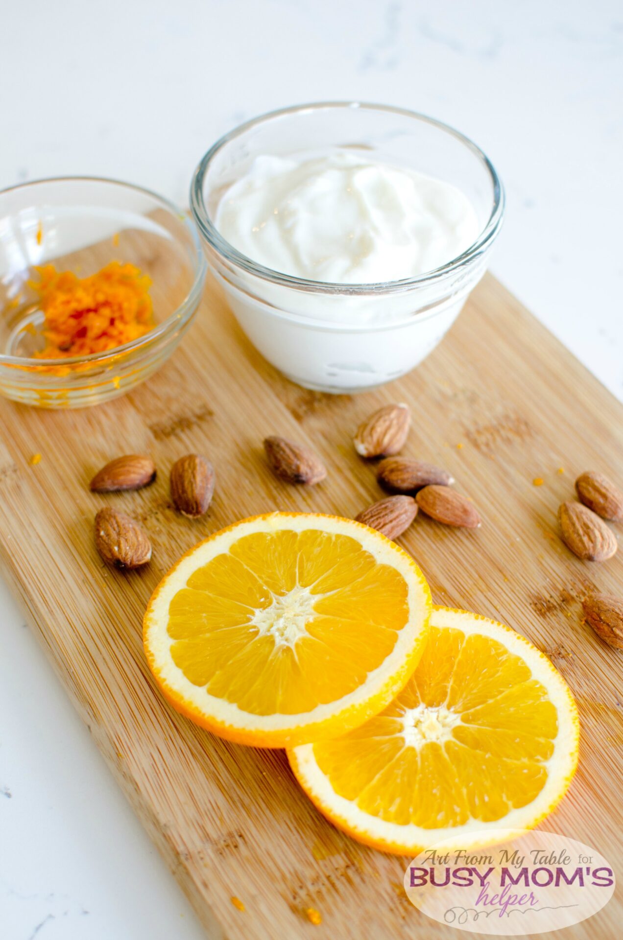 So for my Healthy Orange Julius, you’ll need oranges, orange zest, a banana, vanilla greek yogurt and some almonds. You’ve got it all here folks, protein, vitamin C blah blah blah.