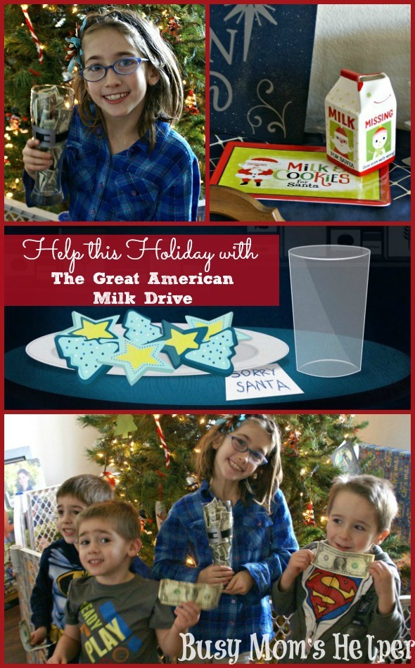 Since Santa gets PLENTY of milk at Christmas, The Great American Milk Drive is asking that we donate his milk to help those in need. Did you know that families that depend on Feeding America food banks receive less than one gallon of milk per person, per year? Our family of 7 now goes through about 1 per person each WEEK! I’m sure the Jolly Ol’ Elf will be more than happy to do with one less gallon or two this season in an effort to make the holidays more memorable for others.