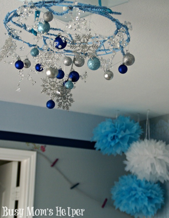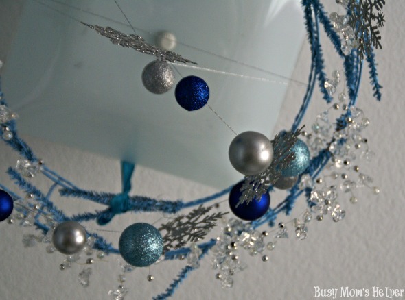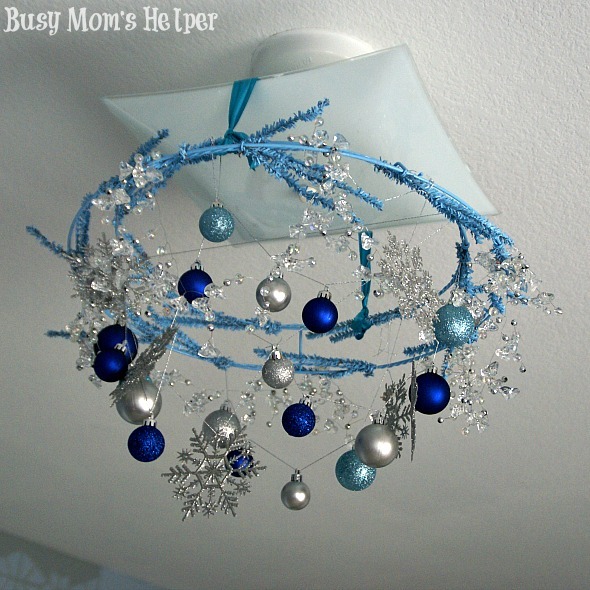 The original Frozen light fixture project we did was still beautiful and fun, but after awhile I decided it needed a change. More sparkle, more spunk. With all the holiday bobbles going on major sales, why not run out and buy the few supplies you need and whip this baby up? Seriously, it took me less than two hours. Can’t get much easier than that!