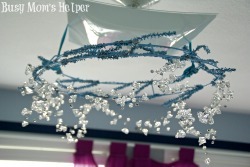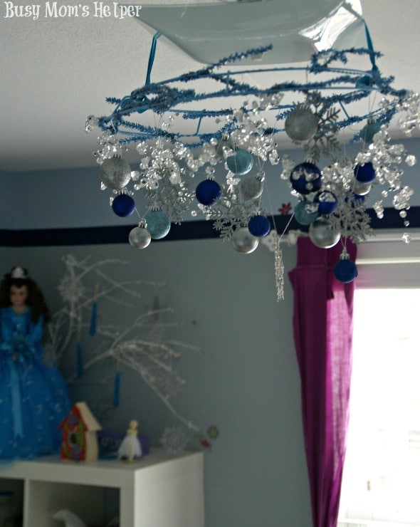 That’s it! Now you have an absolutely beautiful, fun and Frozen chandelier! Use it to decorate a bedroom, as holiday decor, or even for fun parties! Here’s a view from beneath…imagine seeing this pretty image while you’re laying down to sleep at night, or to wake up to in the morning!