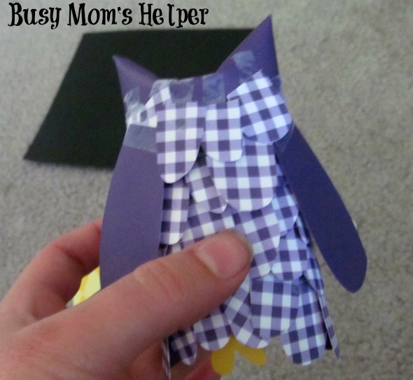 until you’re almost to the top, but not quite! Cut out long rounded-off wings and attach one to each side of your owl. - Cut a little yellow or orange triangle and put it as the beak. Cut out large white circles, then smaller circles for the eyes and overlap them a little bit. Make sure you can still see the cute little ‘ears’ poking at the top.