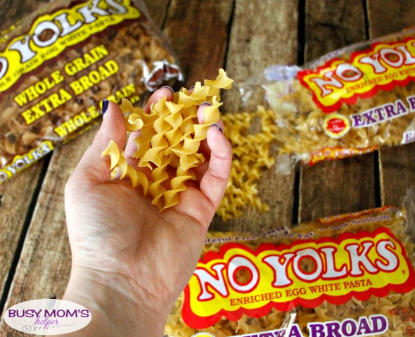 Not only are No Yolks noodles the perfect addition for when you need a delicious meal in a hurry, but they’re also a smart choice because they’re a healthy egg noodle alternative, made from egg whites so there’s no cholesterol. Plus they’re low in fat and sodium, so I feel much better about feeding them to my family! You can nab them in Broad, Extra Broad, fine, Kluski, Dumplings and even Stir-Fry.