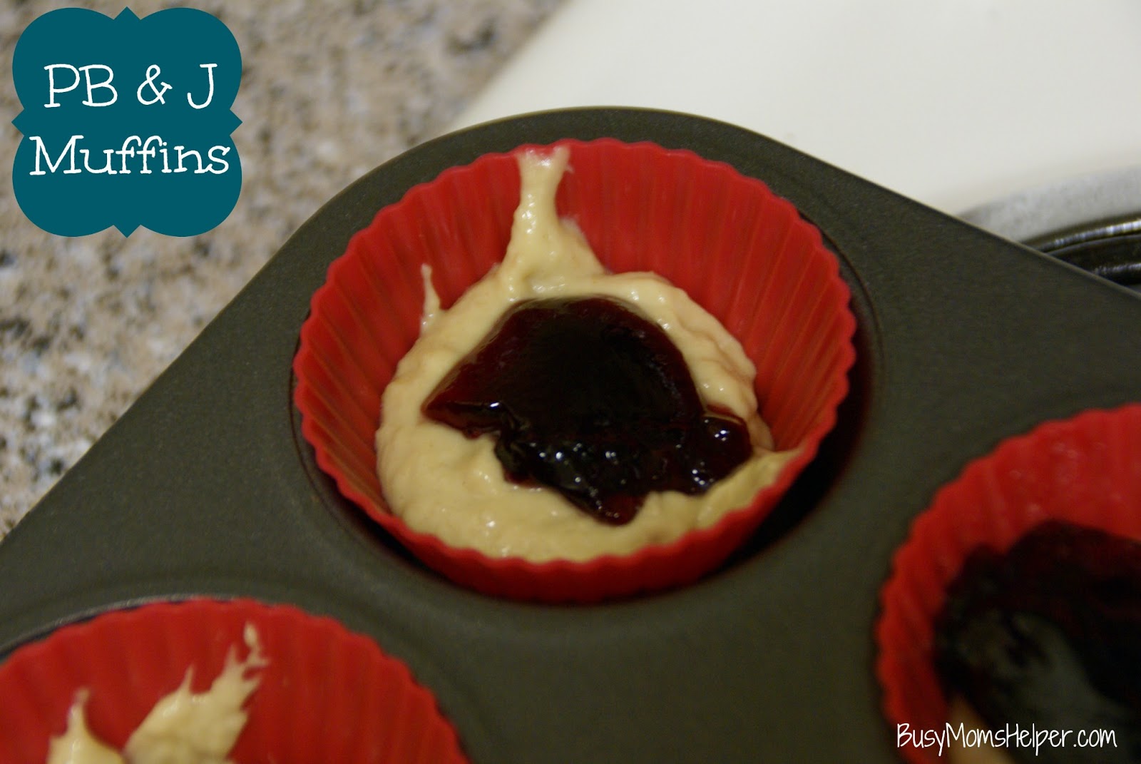 Pour enough batter into the muffin cups just to cover the bottom. Top with 1-2 tsp. Jelly, then cover with more batter until cups are 2/3 of the way full.