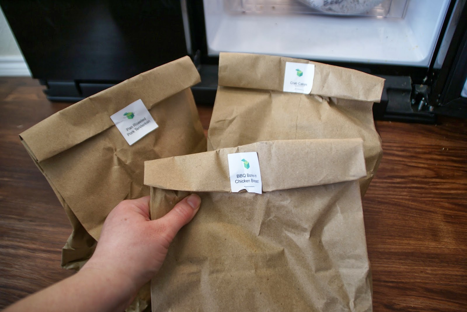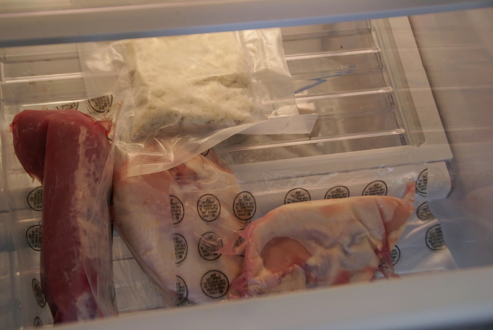 The cuts of meat were individually packaged, completely sealed. Here’s the pork loan, two chicken breasts and crab meat in our crisper, just begging to be cooked!
