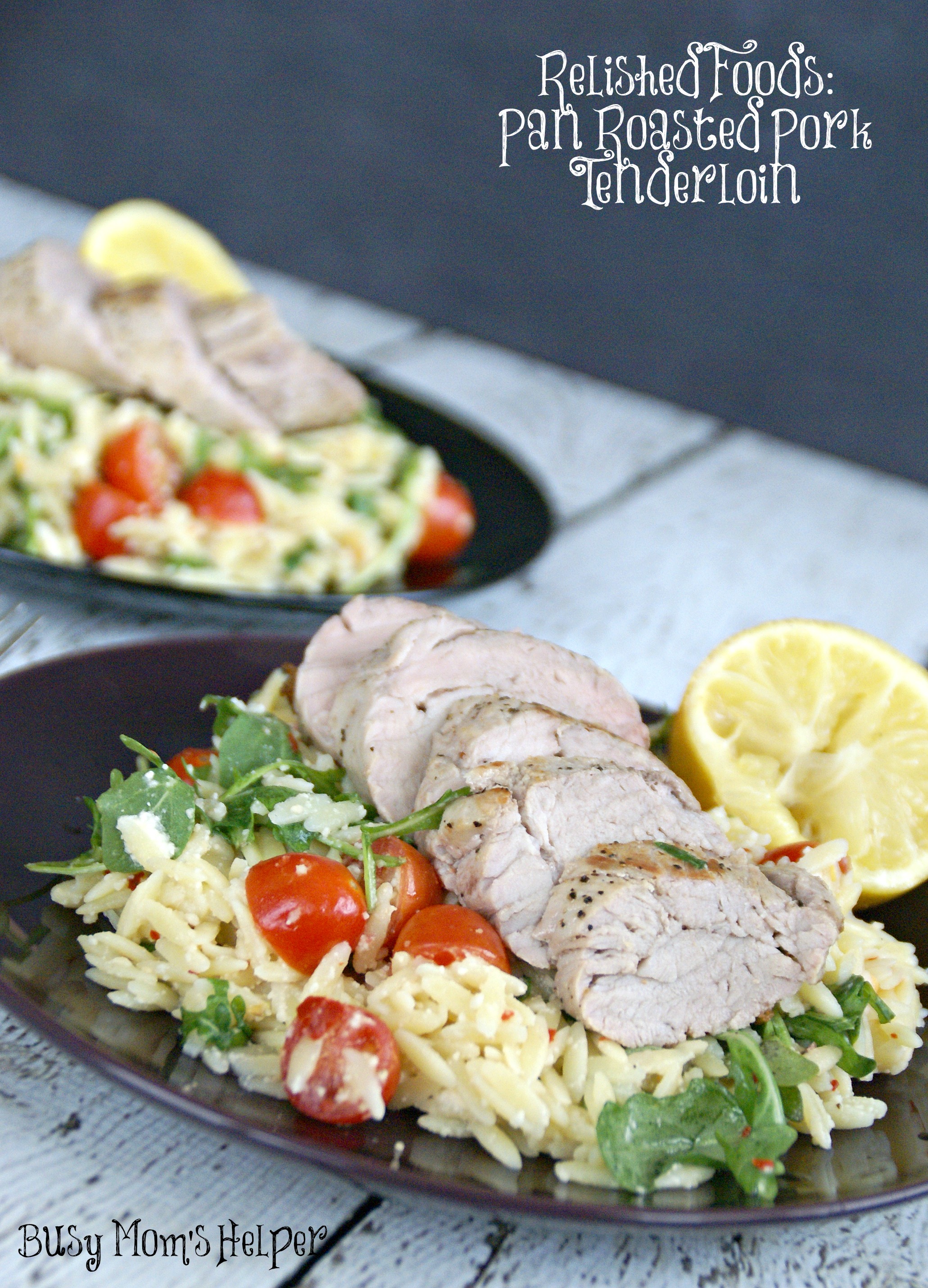Pan Roasted Pork Tenderloin with Orzo, Cherry Tomato, Charred Lemon & Baby Arugula