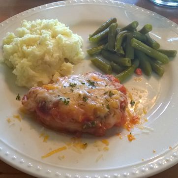 - Let cool a couple minutes and serve! Tastes great with baked potatoes and green beans, can add mushrooms, cilantro, or different kinds of cheeses to the pork chops if you desire.