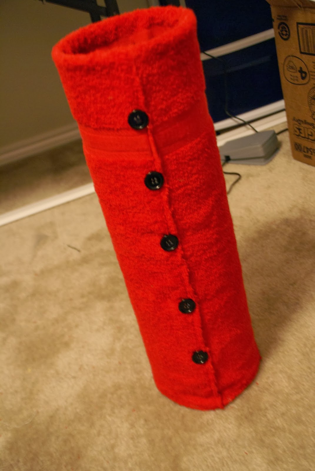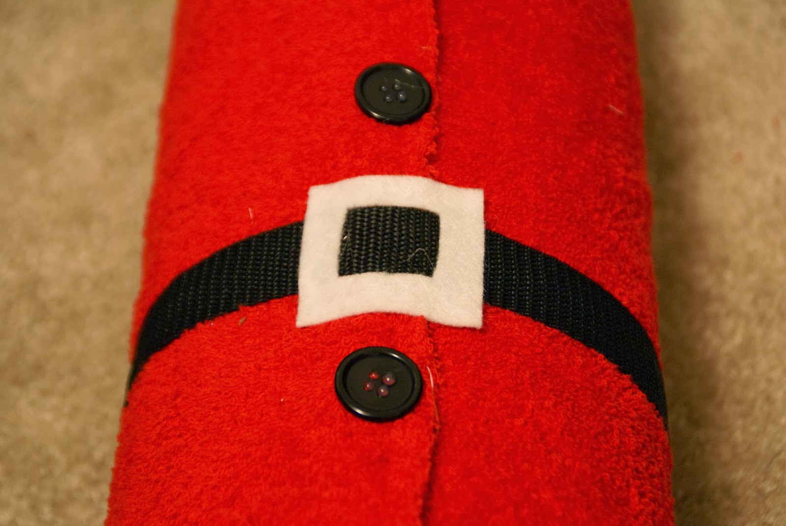 Hot glue some big black buttons along the front, next to the seem. Think of this as Santa’s jacket…the seam being the opening part, so the buttons go right along it’s edge.