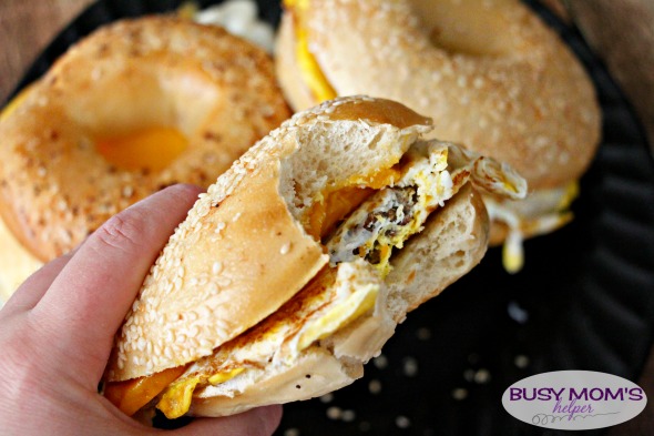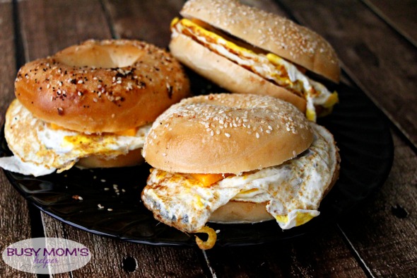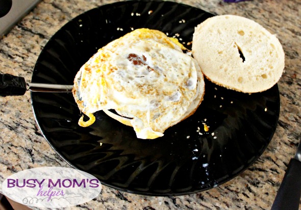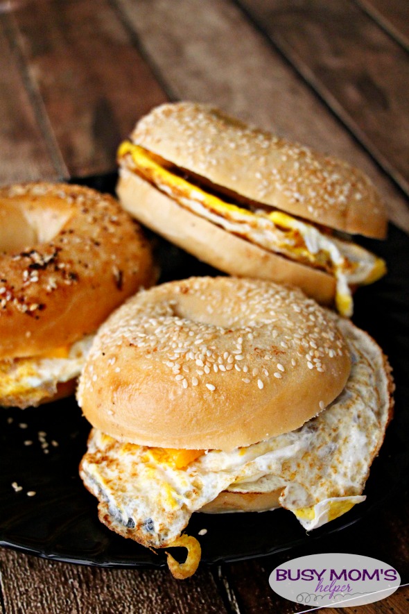 - Once your eggs are to their desired done-ness, place it on your open bagel or english muffin, top with cheese, then add the top slice of bagel. Enjoy warm!