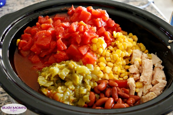 - Put all of the ingredients, EXCEPT the bread bowls and refried beans, into your large slow cooker. Cook on high for 4-6 hours or low for 6-8 hours (make sure chicken is cooked through).