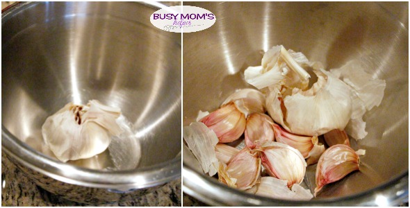 Save yourself some time peeling large garlic cloves with this awesome kitchen hack – take a bulb of fresh garlic and break it up just a bit (like at the top pointy part). Place between two metal bowls and shake aggressively a minute. Your individual garlic pieces should be nice and divided from that annoying, flaky outside layer.