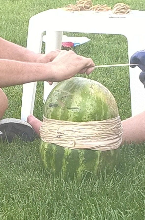 Watermelons are a very popular summer treat and I absolutely love them!  Well what’s even better than eating a watermelon?  Making one explode!  When I was first told about this experiment I thought no way and it’s not going to be cool at all, well I was wrong this experiment is intense and exciting and has you on your toes wondering when it’ll blow, how big is it going to get, and how many rubber bands? Yes you will needs lots of rubber bands and not small ones we had several that were too small and just broke trying to get it over the watermelon.