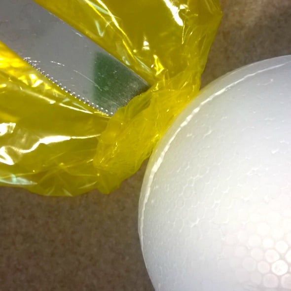 - With your sharp knife cut two lines around your Styrofoam ball around the center ½ inch apart and about ½ inch deep. Don’t cut too deep or it won’t hold the cellophane as well.