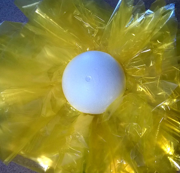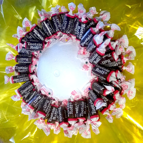 - Starting at the edge of the yellow cellophane poke a pin through the twisted end of the tootsie roll wrapper and insert into the Styrofoam ball.