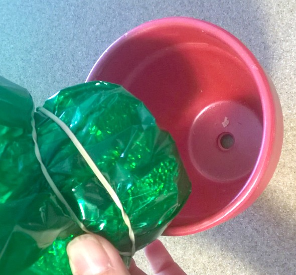 - With your clay pot cut extra Styrofoam to fit in the base. You will want the Styrofoam about 1 inch from the top of the pot. Optional: cover Styrofoam with tin foil and green cellophane to help keep Styrofoam from crumbling everywhere and to fill in with green color.