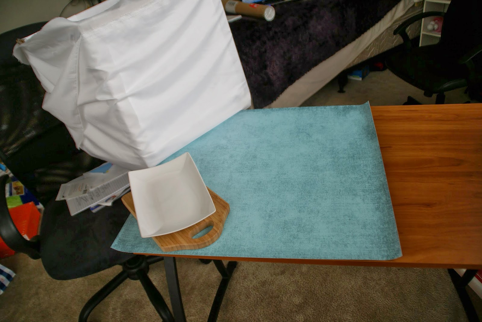 I love the vinyl backdrops, placed on my desk after I move the pile that was previously there onto my bed. My reflective white is propped into position by the desk chair (the chair also covered in a pile of papers). Two huge windows open to allow as much light in, but timed so no direct light hits.