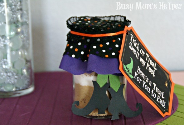- Print out the tags and traceable sheet. Cut out the pieces. Use a glue stick to attach the tag parts to the front and back of some cute paper. Tape the witch shoes to the legs, then the legs to the jar.