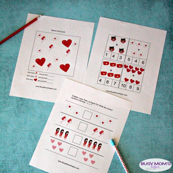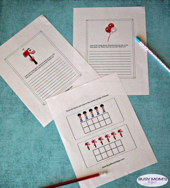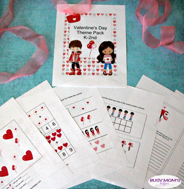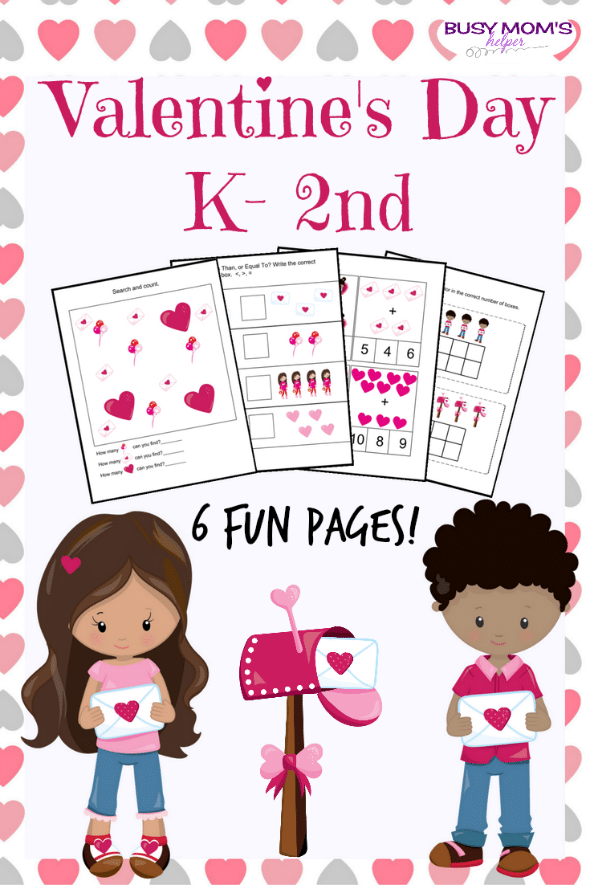 Our fun Valentine’s themed k-2nd Activity Pack comes with 6 pages of activities geared towards learning (the full pack includes 8 pages of printables, including the cover and credit pages).