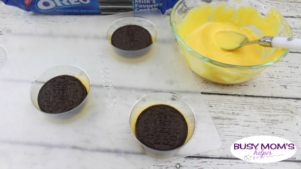 - Fill each cookie mold with 2 tablespoons of the melted yellow candy melts. Place an Oreo cookie on top and then fill up the rest of the mold with additional melted yellow candy.