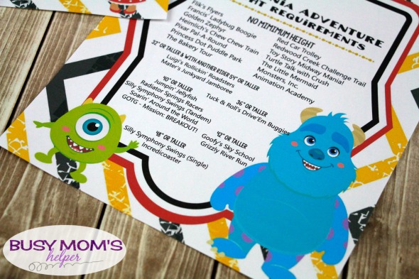 As we get ready for our Disney trips, we have fun with our DIY Disney Countdown, as well as prepare our kids for what rides they can or can’t go on due to any height restrictions. I think that by being prepared, we can help avoid more meltdowns at the parks, making it the best Disney vacation ever! On these printables, you’ll find some favorite characters from each of the parks – like Mike & Sulley for the California Adventure sheet! I couldn’t resist also including Dusty, since he’s one of my boys’ absolute FAVS!