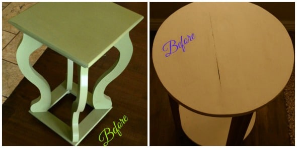 My tables looked like this when I bought them. The square table was in good shape, but I’m not a huge fan of green in large doses, so I knew I wanted to paint it. The round table had been made over by someone else, but I really wasn’t a fan of the style. It also had a crack down the middle, which I didn’t understand in a refurbished table. It’s a style, just not my style.