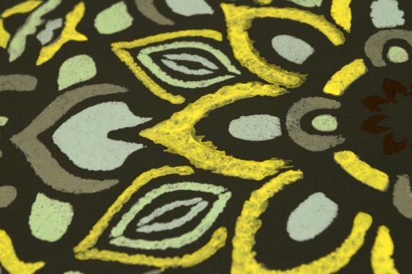Next, to add the paint. I started using a stencil brush, which is just a flat tipped paint brush like this set. The Artist’s Club Papillon Stencil Brush Set. It’s good to have a variety of sizes. When I started the stenciling, I thought I would just use one color for the whole stencil. That is what I started doing and then, about a third of the way through the first table, I changed my mind and went looking though my paint stash to see what struck my fancy. Ends up, it was 5 colors instead of one.